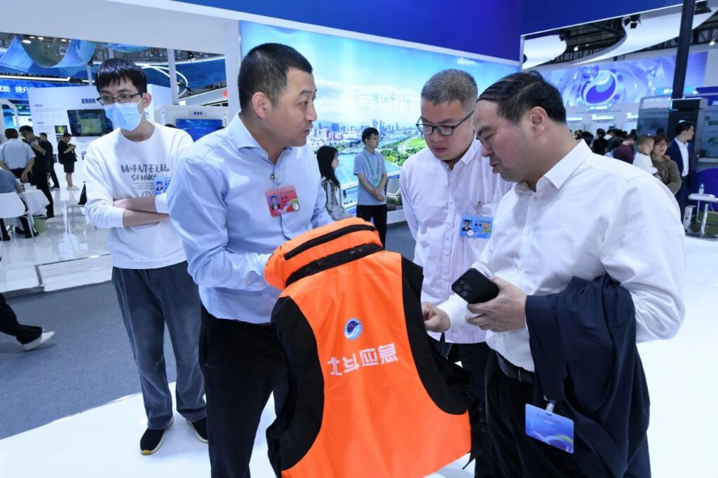 福信富通董事长、总经理李勇给与会嘉宾介绍北斗智能定位救生衣
