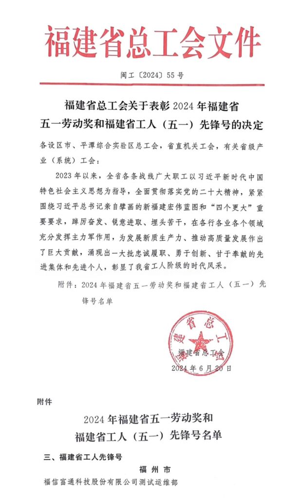 日前,福建省总工会发布《关于表彰2024年福建省五一劳动奖和福建省工人(五一)先锋号的决定》,其中,福信富通科技股份有限公司(以下简称“福信富通”)测试运维部荣获“福建省工人先锋号”称号!作为福信富通北斗创新应用的测试运维团队,测试运维部现有成员12人,平均年龄29岁,党员占比33%。2023年,团队荣获“福州市工人先锋号”称号。