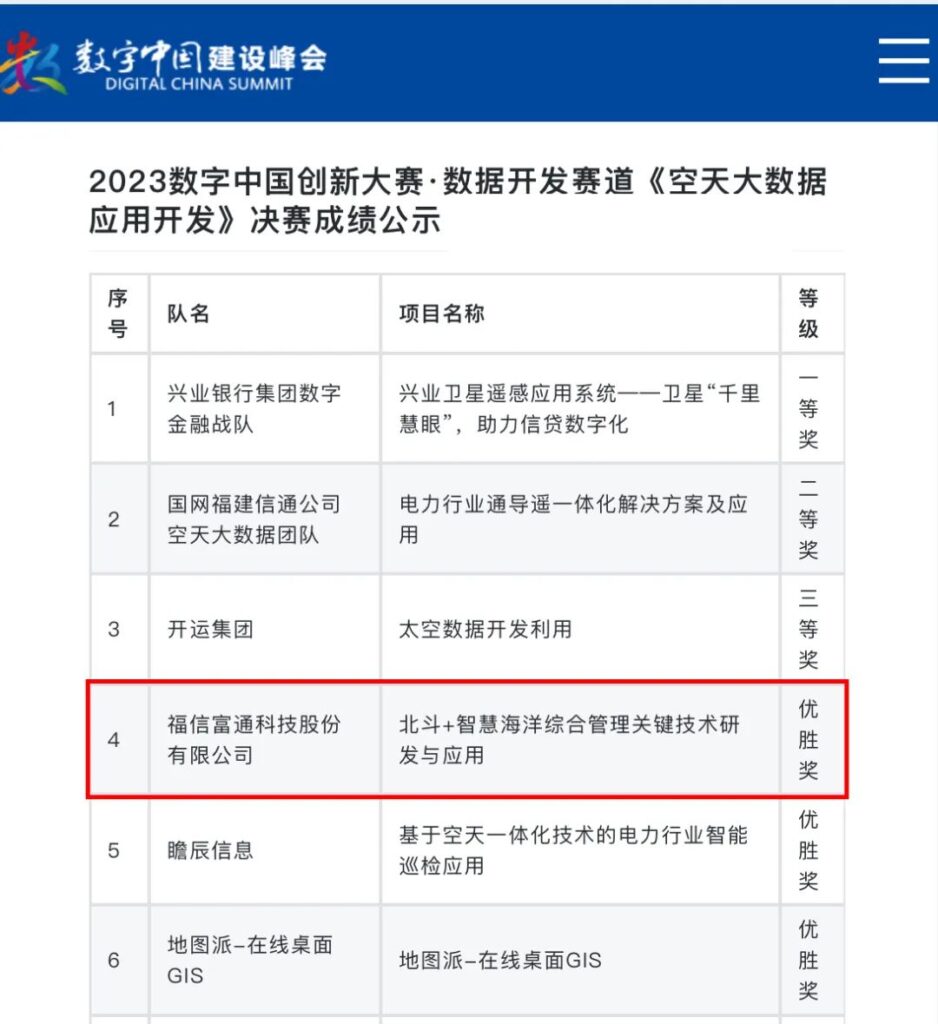 经过层层角逐,福信富通“北斗+智慧海洋综合管理关键技术研发与应用” 从全国246支团队中脱颖而出,荣获2023数字中国创新大赛•数据开发赛道空天大数据应用开发赛题总决赛全国第四名。